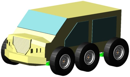 As shown in Figure 2, the 6 × 6 wheeled vehicle model is designed and established in SolidWorks. The drive mode selects direct drive of each wheel. The suspension adopts three sets of MacPherson independent suspension systems. The 6 × 6 wheeled vehicle was chosen because it offers greater flexibility and more powerful output compared to a 4 × 4 wheeled vehicle. Additionally, it provides better reliability and easier coordination control compared to an 8 × 8 wheeled vehicle.