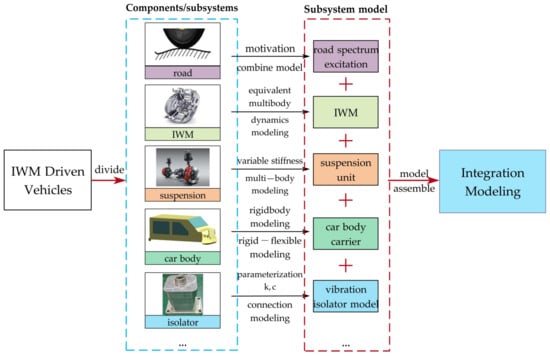 Both the IWM and the occupants are facing complex working conditions and harsh environments. In order to establish a precise vehicle model driven by IWM in the modeling process, the analysis model should be constructed from a global perspective. In order to reflect the influence of different system characteristics on the drive characteristics of the IWM, a new comprehensive strategy for global system modeling “road environment–hub unit–suspension–vehicle body–vibration isolator–vibration-isolated body” is proposed in Figure 3.