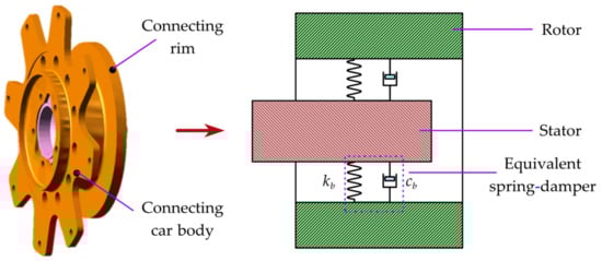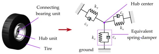 The hub bearing unit is equivalent to a mass-spring–damping system, as shown in Figure 4. The inner ring and the outer ring of the bearing are constructed as rigid parts. The radial support stiffness and damping effect of the bearing are mainly considered between the inner ring and the outer ring (spring–damper).