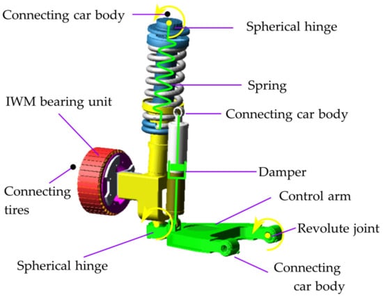 It is worth noting that there are inaccuracies in the dynamic equivalent representation, as shown in Figure 10b. As depicted in Figure 11, the actual location of the equivalent spring model should be between the vehicle body and the IWM bearing unit, rather than directly above the IWM bearing unit.