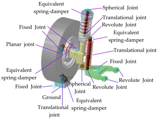 The schematic diagram of the structure modeling of the suspension part is shown in Figure 6 for during the modeling process. In this part, the vibration damping performance of the suspension is mainly considered. The steering part is ignored.