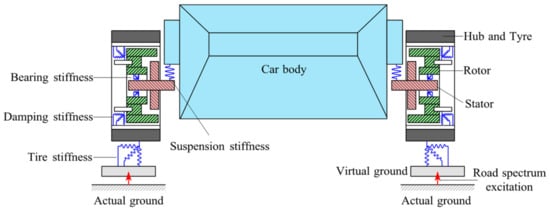 In Reference [], the influence of vehicle speed on vertical vehicle vibration was studied []. After installing a bushing structure inside the IWM, Luo et al. established a quarter-vehicle vibration dynamics model to mitigate the increase in unsprung mass caused by motor magnetic gap (MMG) deformation []. Jin et al. developed an uncertain quarter-vehicle active suspension model with a dynamic damper IWM-drive system to improve the vibration performance and ride comfort of electric vehicles []. Nah et al. conducted a study on improving vehicle lateral stability and maneuverability by developing a vehicle stability controller through the establishment of an IWM vehicle model []. Drexler et al. established three types of whole-vehicle models. These models are based on a two-stage suspension structure, with electric motors used for tuning mass dampers and traditional hub motor designs []. The results indicate that the two-stage suspension increases body pitch and vertical acceleration under various driving conditions, while the acceleration of the motors and the lateral acceleration of the vehicle (especially during turning maneuvers) can be significantly reduced. There are many other studies on the dynamic modeling and analysis of IWM-driven vehicles [,,]. These papers are based on the dynamics modeling and analysis of IWM-driven vehicles to optimize vehicle performance.