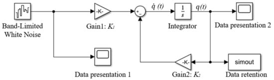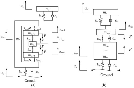 In order to model vehicle dynamics in MATLAB, Figure 10a shows a schematic diagram of multi-body modeling of a 1/6 vehicle model. In Figure 10, is the sprung mass, (body mass); and are the stiffness and damping of the vehicle suspension; is the mass of the tire subsystem; is the mass of the IWM stator; and are the masses of the IWM rotor; and are the stiffness and damping of the tire; , , , and are the stiffness and damping of the bushings between the rotor and the tire; is the stiffness of the hub bearing unit; F is the interaction force of the motor; is the excitation displacement of the ground; is the wheel displacement; is the vehicle body displacement; and are the displacements of the motor; and is the displacement of the stator.