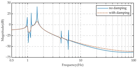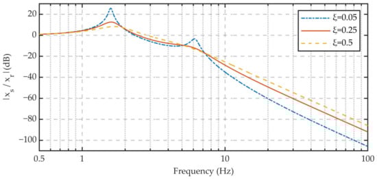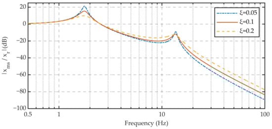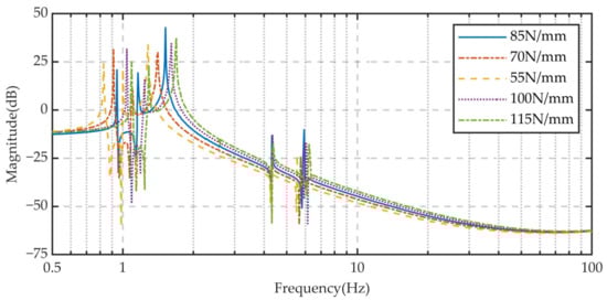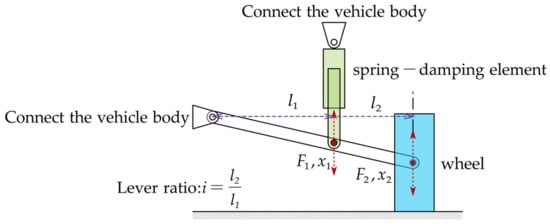 From Equation (12), it can be observed that the suspension stiffness is times the converted overall stiffness of the wheel. When the leverage ratio, , is less than 1, the converted overall stiffness is less than the suspension stiffness.