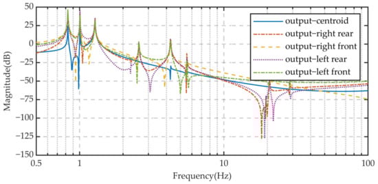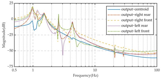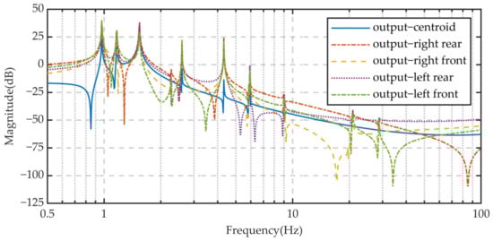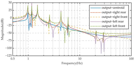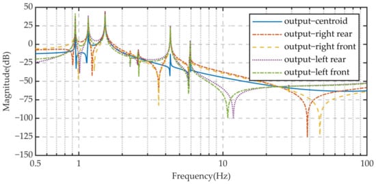 This section employs frequency-domain vibration analysis to obtain the vibration mode of important orders of the whole vehicle and the vibration transmission characteristics among key parts. To validate the accuracy of the theoretical model, the vibration modes obtained from solving the vehicle’s ADAMS model and the transmission characteristics of ground vibration are compared with the solutions from the MATLAB model. Additionally, the impact of subsystem units, such as the hub unit and suspension unit, on the overall vehicle vibration is analyzed under different isolation parameter configurations. Furthermore, optimization targets that can enhance the isolation performance of the IWM system and the overall vehicle damping system are extracted. The parameters of the important components of the special vehicle model are shown in Table 4.