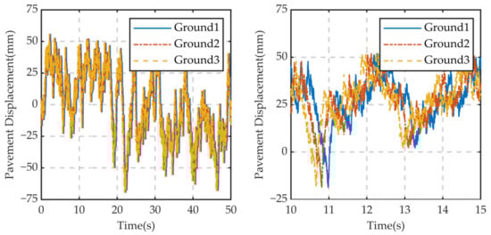 From Figure 26, Figure 29, Figure 30, Figure 31, Figure 32, Figure 33, Figure 34, Figure 35, Figure 36, Figure 37, Figure 38, Figure 39, Figure 40, Figure 41 and Figure 42, it can be seen that the acceleration at the vehicle’s center of mass is the lowest among the five measurement reference points under the same speed and road conditions. Since each tire is driven by its respective IWM and the road positions encountered by the tires vary, the acceleration–time curves obtained from different measurement reference points differ. Table 9 also shows that the peak acceleration and acceleration RMS values at different measurement reference points vary, although they fluctuate within a reasonable range. It is evident that the increase in speed and more severe pavement conditions lead to higher acceleration at each response point. Moreover, the increase in acceleration when moving from C-class to E-class pavement is more significant than the increase caused by speeding up from 10 m/s to 30 m/s on C-class pavement. Additionally, it is worth noting that, as the vehicle speed increases, the ratio of acceleration difference between the vehicle’s center of mass and other measurement reference points decreases. However, when the pavement class changes from C to E, this ratio remains relatively unchanged. This indicates that the increase in speed causes the measurements at different reference points to converge.