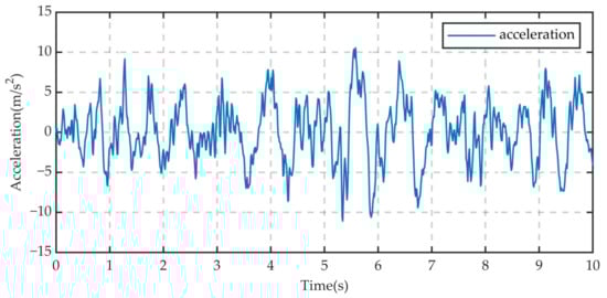 Acceleration–time curve of the car body’s left front at 10 m/s on the E-class road.