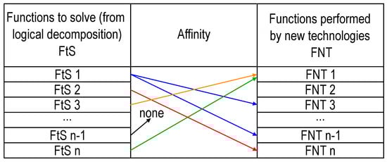 The functional affinity analysis (FAA) would be an intermediate step between the conceptual design and basic design, as shown in Figure 4. This tool requires designers to extract a list of functions from the logical decomposition (FtS), and also a list of functions performed by new technologies (FNT) which, in this case, come from Table 1. Once both lists are extracted, the idea is to look for matches between the two lists, without checking any specific technology or component name. With this strategy, we aim for designers to genuine problem (FtS) and solution (FNT) match without prejudice towards the technology or component to be used, as seen in Figure 5. After the matches have been established, the technology name is made explicit and the possible solution will be part of the possible solutions obtained on the divergent stage. This strategy can be used along other known divergence tools as SCAMPER, brainstorming, morphological matrix, etc.