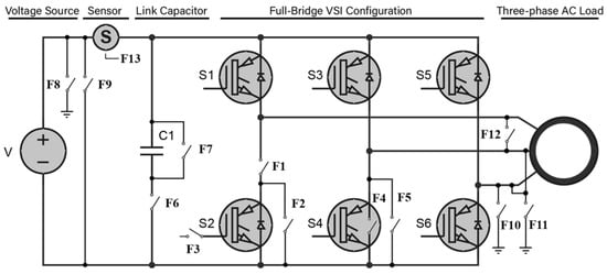 When developing an inverter to use in the previously mentioned application fields, some important considerations must be taken that facilitate a precise operation with optimal performance to guarantee the dependability of the inverter, particularly in applications associated with safety. The operating experience of the VSI states that the most vulnerable components are the power switches (semiconductors), electrolytic capacitors, and the printed circuit board (PCB). Locations of all the possible faults that can occur in the overall chain, including the DC source, VSI, and the AC three-phase load, are shown in Figure 1.