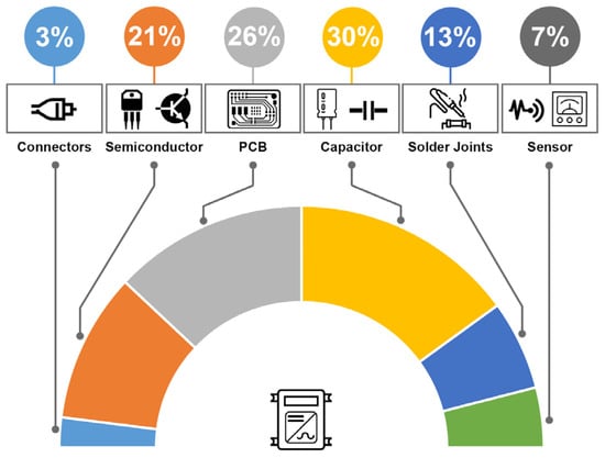 The statistical distribution for the failure rate in various parts of the VSI is represented in Figure 2 [83]. There are numerous factors that contribute to these faults; among them are the overheating of the power switches caused by overloading and control failure, as well as external causes such as mechanical accidents and the impacts on the overall structure of the inverter. According to the data chart in Figure 2, the reliability level of the VSI depends on the reliability values of each component.