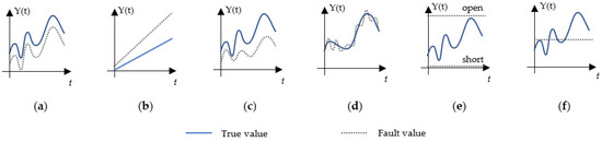 Sensor fault types: (a) bias, (b) gain, (c) drift, (d) noise, (e) short and open, (f) freezing.