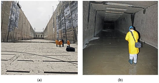 The ship enters the ship lock, and next, the huge gate is closed. The ship lock is filled with water up to the height of about an 8-floor building. On the return way, the water is drained, and the ship is sinking down. Emptying of the ship lock takes from 15 to 19 min. The entire filling and draining system, located at the bottom of the ship lock (Figure 2 and Figure 3), is arranged to minimize frictional losses and to prevent the creation of dangerous water vortexes during the ship lock operation. Inside the corridor system (Figure 3b), the flowing water reaches a speed of up to 12 m/s.