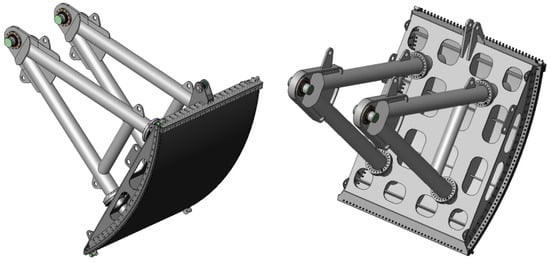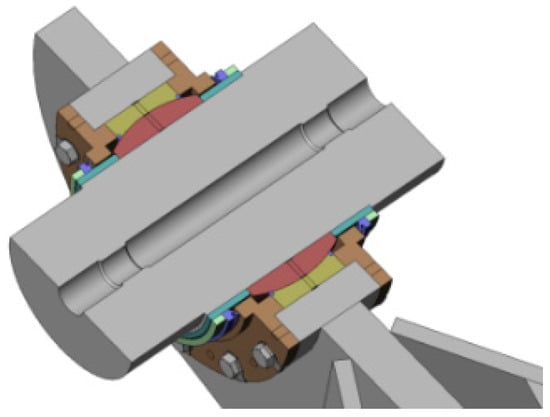 The check gate consists of a welded segment body and two actuating arms. The body of the check gate is a weldment, which is created by a covering metal sheet rounded into a cylindrical shape with an outer radius of 5800 mm and a width, including the seal, of 4000 mm. The shape of the supporting structure is similar to a closed profile. Large oval holes were created in the upper part of the segment. The cover metal sheet is made from stainless steel with an initial thickness of 30 mm, after processing 25 mm. The pipes and flanges determined for connecting the actuating arms are installed in the side parts of the segment. The metal sheets with a thickness of 25 mm are mainly used here. The actuating arms are welded from the 406 × 25 mm tubes, equipped with connecting flanges at the ends for connection to the segment. The placement of the check gate segment and cross-section of the working chamber are shown in Figure 5. Inside the bearing body is installed the stainless steel self-lubricating spherical sliding bearing (Figure 6). Figure 5a (on the left) illustrates the basic frame of the check gate construction. This frame is fixed inside the working chamber. A small frame is situated in the upper part of the frame, to which a linear hydraulic motor is attached. This hydraulic cylinder enables the pushing out and retraction of the check gate. On the sides of the frame, there are installed fixtures to which the check gate sealing is attached. Figure 5b (on the right) offers a view of the check gate in the pushed-out (open) position.