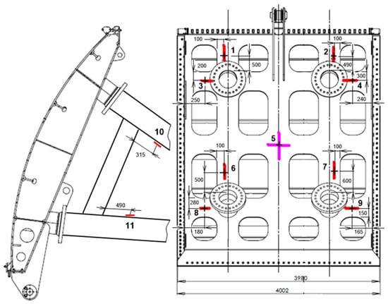 The strain gauge sensors were applied to the check gate segment, as shown in Figure 7. Originally, a different placement of the sensors was planned. Except for sensor No. 5, the application places of the other sensors from No. 1 to No. 9 had to be shifted from the center (according to the axis of symmetry between the holes in the segment) because the black box construction was proposed for an even surface. The pre-selected application places of the black boxes showed considerable unevenness. There were welded reinforcing ribs on one side of the plate, and on the other side of the plate were situated fixtures determined for attaching sensors with other constructional solutions. Therefore, the black box could not be sufficiently sealed against pressurized water in a prepared manner on such a surface. We were looking for such places that would be located as close as possible to the proposed ones, but the places with sufficient planeness, which is necessary for sealing the black boxes and at the same time ensuring that the measured data would not be affected by the welds or by reinforcing ribs situated on the welded construction. Compared to the original design, sensors No. 6 and 7 are placed above the flange because it was not possible to reach the indicated places with the applied technical equipment when the segment was in the top pulled position. On the other hand, when the segment was in the bottom position at the time of measurement, the chamber was flooded with about 2 m of water. Sensors No.10 and 11 were placed in such a way that the fixing cables of the measuring boxes did not have to go around the obstacles.