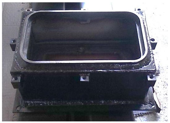 During the standard operation, the measured segment is flooded with water and is exposed to significant pressure caused by the flowing water. This fact required a technical proposal for such a measuring device that is able to work in these extreme conditions and, at the same time, must meet waterproof conditions to prevent damage to the measuring electronics. For this purpose, a special waterproof box (Figure 8) was designed, which was firmly fixed to the check gate segment. This special box ensures the protection of both the strain gauge sensors and the power supply battery, together with the measuring electronics.