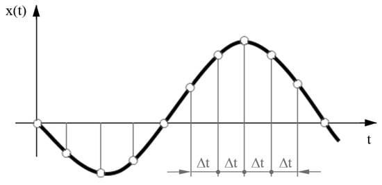 Signal sampling was programmed by recording the signal in the equidistant time intervals ∆t (Figure 12). If the maximum (the highest) frequency of the analyzed signal is known in advance, the sampling frequency can be determined according to the Shannon–Kotelnik criterion ∆t = 1/2 fmax. If it is required to obtain the characteristics of a random process, it is suitable to choose higher values of the sampling frequencies. Namely, in our case, the applied sampling frequency value was fs = (8 to 10) fmax.
