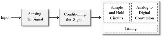 The electrical signal generated by the strain gauge sensor (by changing the sensor resistance) is processed in accordance with the sequence, which is presented in Figure 13.