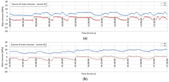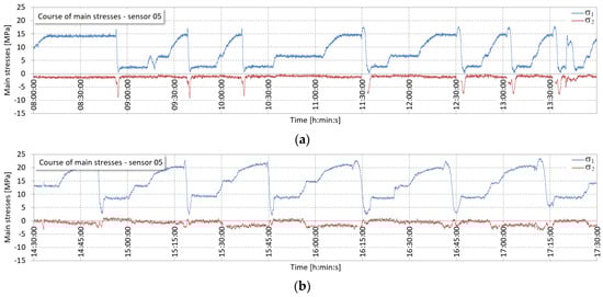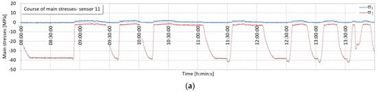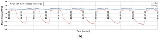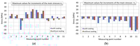 Figure 15, Figure 16 and Figure 17 illustrate the stress values obtained from the selected measured locations (measuring locations No. 1, 5, and 11) during the measurements performed with and without sealing. Figure 18 summarizes maximum values for increments of the main stresses at measuring with and without sealing in all 11 measurement locations.