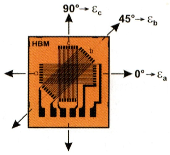 After recording the measured data and after their processing, the values of the main normal stresses were determined using the strain gauge rosette 0°/45°/90°, based on relative prolongations of the strain gauge sensors installed in the rosette. The main normal stress values were determined according to the relative prolongation of the strain gauge sensors in the strain gauge rosette using Equation (1). In this equation, the input values are relative prolongations ɛa, ɛb, ɛc in three directions: a, b, and c—always in one given rosette—as shown in Figure 19.