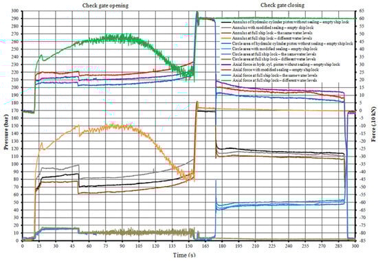 Within testing of the sensors, the unloaded segment was manipulated to the maximum upper position and also to the minimum lower position during the so-called “dry measurements”, which means without filled water. The data obtained from this measurement were used to determine the pressure values in the hydraulic cylinder during empty handling, i.e., on condition when the segment is loaded only by its own weight. Two main measurement modes were defined for the realization of the measuring process. These modes were repeated three times. The first measuring mode simulated real operational conditions, and the second measuring mode simulated analogous conditions, however, at a reduced opening speed of the check gate. The real operational conditions included draining the ship lock until such difference in water levels, which is used during the operational mode and at the opening speed of the check gate set up according to the operational rules. The whole measurement was carried out for two days. On the first measuring day, the measurements were performed on the check gate with the installed check gate sealing. During the second measuring day, the measurements were realized without the check gate sealing but using the same measuring regimes. Disassembly of the sealing required cooperation with divers.