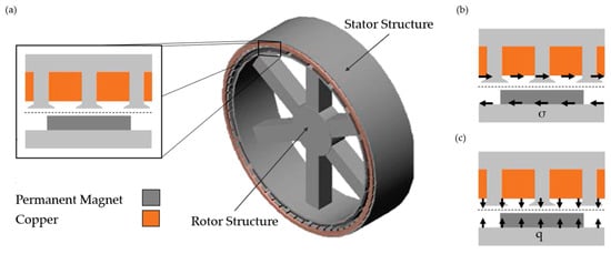 q”, or normal stress, is the electromagnetic force generated in the direction of the magnetic flux across the air gap between the rotor and the stator, having a typical value of 200–400 kPa for these electrical machines. Shear stress “