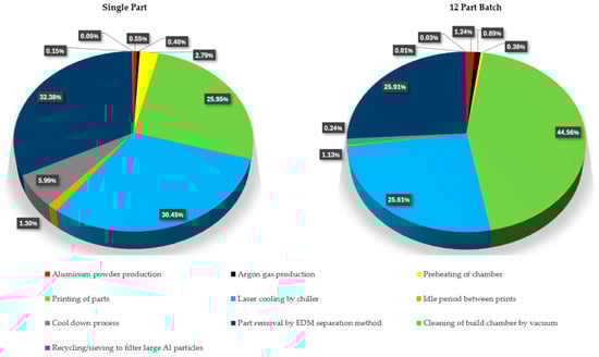 Figure 5, an example of energy efficiency assessment has been addressed with a visualization of the energy consumption percentages for a metal additive manufacturing process using selective laser melting (SLM) technology and AlSi10Mg as printing material.