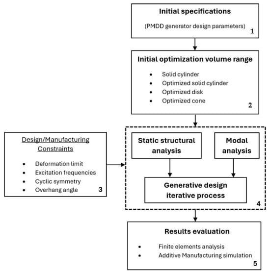 The process starts by determining the electrical generator design parameters and specifications, the considerations for the diverse optimization volume ranges for the different approaches, and the integrated structural optimization strategy, including the static structural analyses, the modal analyses, and the design and manufacturing constraints as part of the iterative generative design stage.