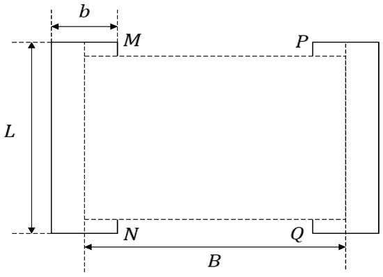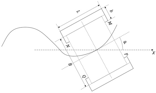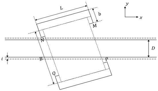 The stepping trajectory needs to ensure that the tracked vehicle traveling along the trajectory will not collide with the road surface to be constructed, and the grounded part of the tracked vehicle has only two sides of the track, so only the contact between the track and the road surface needs to be considered in the collision analysis. The track is simplified as a rectangle with length and width . The center distance between the two sides of the track is , and the inner vertices of the left and right tracks are , , , and , respectively, as shown in Figure 1.