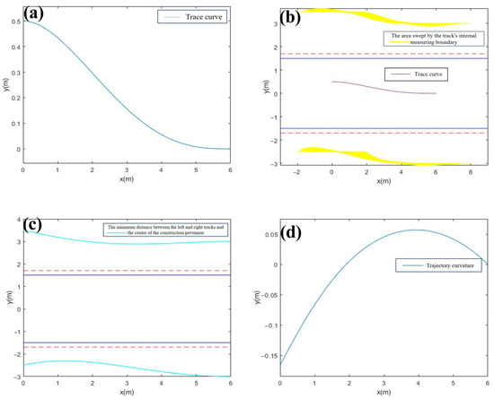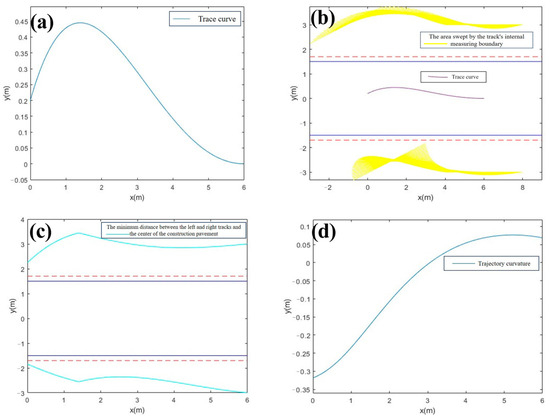 Simulation output of working condition 1: (a) trace curve; (b) the area swept by the inside of the left and right tracks; (c) the minimum distance between the left and right tracks and the center of the road surface to be constructed; (d) trajectory curvature.