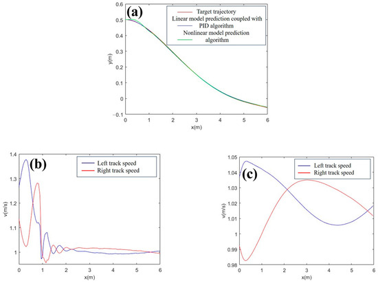 Co-simulation output results: (a) trace curve; (b) linear models predict left and right track speeds; (c) nonlinear model predicts PID coupled left and right track speed.