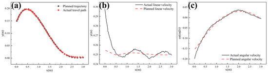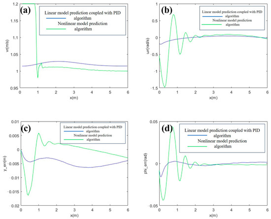 As can be seen in Figure 7, both models can track the trajectory better, and the nonlinear model prediction control has a smaller amount of change in speed and no obvious oscillation due to the addition of PID coupling control. The analysis of the joint simulation results and their deviations are shown in Figure 8. On the whole, the speed curve of linear model prediction and PID coupling control is more stable, but the angular speed difference between the two control methods at the end point is not much, and both meet the expectation of smooth stopping. The lateral position deviation in linear model prediction and PID coupling control is within , and that in nonlinear model prediction control is within , both of which are much smaller than the safety limit of , so both controls satisfy the collision limit requirements. The amplitude of the transverse swing angle deviation in the nonlinear model prediction control is larger, which is because the vehicle position deviation is larger and the linear velocity is smaller in the starting stage, which easily has small overshoots and oscillation. The linear model prediction algorithm joins the PID speed controller to reduce the instability in the starting stage effectively. Both the linear model prediction and PID coupling algorithm and the nonlinear model prediction algorithm can excellently accomplish the trajectory tracking task, but the former is better than the latter in terms of speed tracking, smoothness and tracking performance in the start phase.
