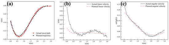 Test 2 result. (a) Trajectory tracking effect; (b) linear speed tracking effect; (c) angular velocity tracking effect.