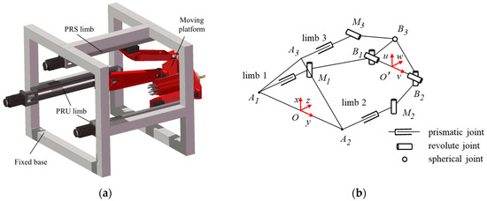 According to the twist systems formulated in Equations (4) and (5), the constraint wrenches of the PRU limbs (limb 1 and limb 2) and the PRS limb (limb 3) can be expressed as follows: