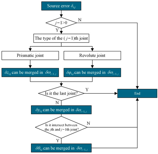To simplify the error modeling, redundant source errors in a limb structure can be merged. To be specific, when the (j − 1)th joint is a prismatic joint, can be merged into ; when the (j − 1)th joint is a revolute joint, can be merged into ; when the (j − 1)th joint is not the last joint, is not included in the transformation. Moreover, if the (j − 1)th joint is not a prismatic joint and the motion axes of the (j − 1)th joint intersect with the jth joint, cannot be included in the transformation. Following the elimination process, depicted as Figure 3, the simplified source errors of the three limbs can be obtained and expressed as follows.