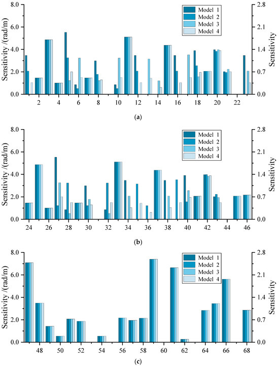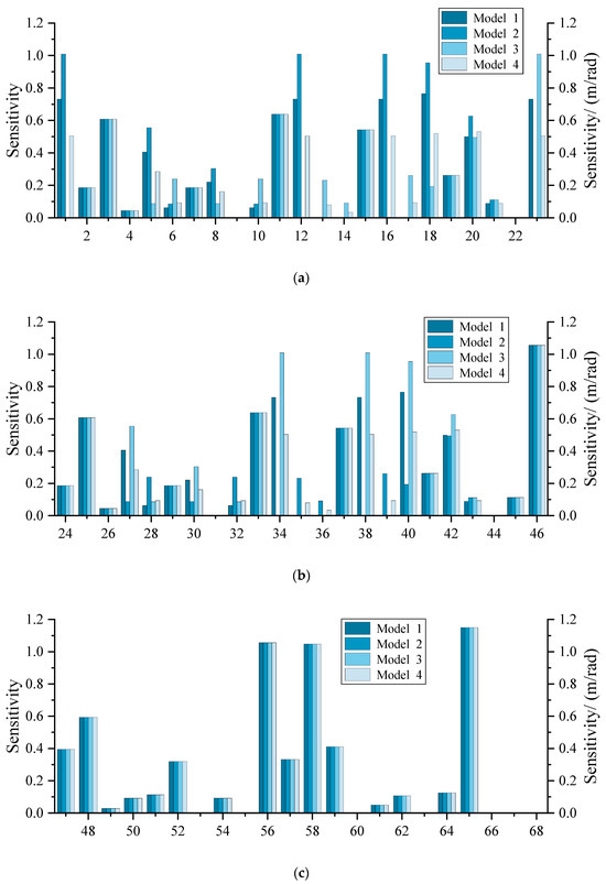 Sensitivity indices of geometric source errors regarding terminal orientation error: (a) sensitivity indices of the 1st to 23rd source errors; (b) sensitivity indices of the 24th to 46th source errors; (c) sensitivity indices of the 47th to 68th source errors.