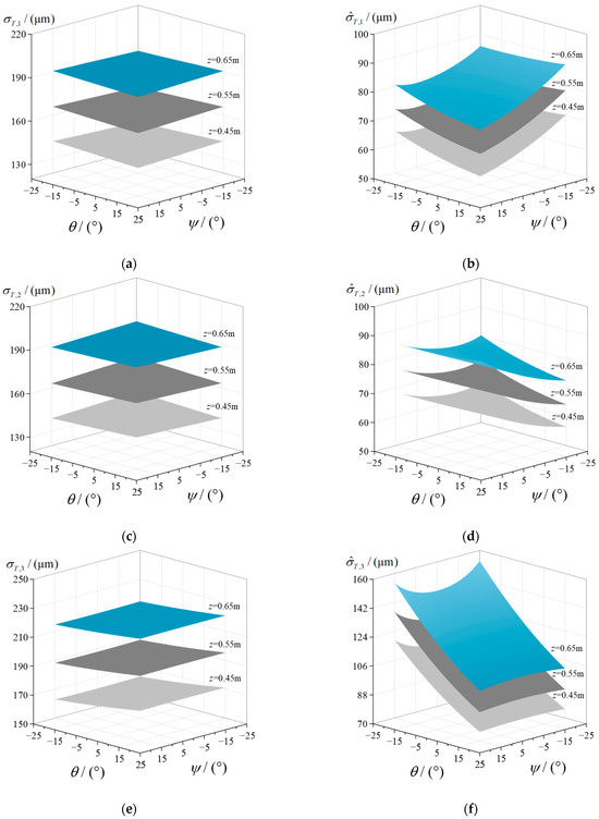 Figure 6a,c,e shows the variations of the linear error propagation index of the three limb structures. It can be seen that the linear error propagation indices of all three limbs increase with the increase in the position coordinate z and are less impacted by the orientation coordinates ψ and θ of the spindle head’s platform. Figure 6b,d,f shows the variations of the coupled linear error propagation index of the three limb structures. It is obvious that the coupled linear error propagation indices of the three limbs are mainly impacted by the orientation coordinates ψ and θ, rather than the coordinate z.