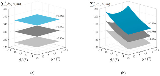 Figure 8a,c illustrate the distributions of linear and angular errors at the spindle head’s terminal, respectively, when the kinematic interactions of the three limbs are not considered. It is evident from the figures that the terminal linear error is significantly influenced by the position coordinate z, while the angular error is unaffected by both z and the orientation coordinates ψ and θ. In contrast, Figure 8b,d show the distributions of linear and angular errors at the spindle head’s terminal when the kinematic interactions of the three limbs are taken into account. Both linear error and angular error at the spindle head’s terminal are significantly influenced by both the position coordinate z and the orientation coordinates ψ and θ, demonstrating clear position dependence. To reflect the impact of the kinematic interactions of limbs on the terminal accuracy of the spindle head intuitively, it is convenient to take the relative deviations of / and /, as expressed in the following:
