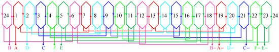 Figure 1 presents the topology of the proposed highly reliable PMSM. It can be seen that this design consists of two parts, the outer stator and inner rotor. In Figure 1a, the stator consists of two different teeth, including armature teeth and auxiliary teeth. The auxiliary teeth are designed in a trapezoidal shape to reduce the short-circuit current and enhance reliability. With 24 slots in the stator, the number of the auxiliary teeth is 24. Moreover, a double-layer, dual three-phase winding structure is adopted in the stator. The winding connection diagram of the stator is shown in Figure 2. The double-layer winding structure processes the capability to reduce the temperature rise and noise. Moreover, the dual three-phase winding structure can ensure the fault-tolerant operation of the PMSM under a set of open-circuit winding faults, significantly improving the reliability. In Figure 1b, the rotor consists of the rotor core and radially magnetized permanent magnets. The rotor adopts a built-in structure, and the permanent magnets are arranged inside the rotor core. The number of rotor pole-pairs is 10. Additionally, the magnetic barriers are designed on the rotor core to reduce magnetic flux leakage. Since the rotor without magnetic barriers is partially saturated, the region of partial saturation is designed with a magnetic barrier and is similar in size. In order to simplify the processing difficulty, the magnetic barrier is designed with a rectangular shape. The design dimensions and structural parameters of the proposed highly reliable PMSM are listed in Table 1. Moreover, all material data of the PMSM are listed in Table 2.