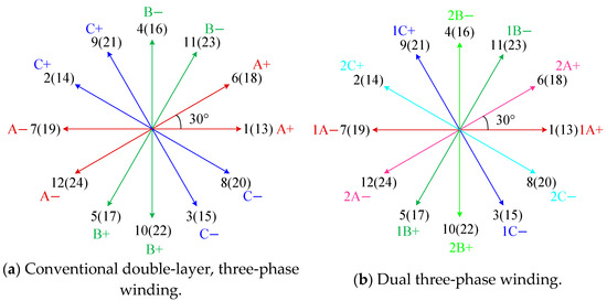 Different winding structures and slot vector star diagrams. (a) Conventional double-layer, three-phase winding. (b) Dual three-phase winding.