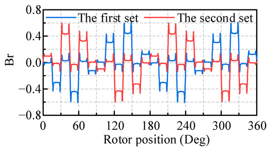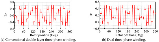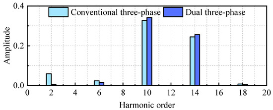 The stator magnetomotive force distributions generated by each set of windings separately in the dual three-phase winding structure are solved by finite-element analysis, as shown in Figure 4. It can be seen that the amplitude of the magnetomotive force remains consistent across each set of windings. The two sets of windings are completely independent. However, there exists a phase difference between each set of windings. Moreover, the stator magnetomotive force distributions under the conventional three-phase winding and dual three-phase winding are solved by finite-element analysis and compared, as shown in Figure 5. It is evident that the magnetomotive force distributions are different, resulting in distinct harmonic content. Due to the double redundant winding structure of the dual three-phase winding, the fault-tolerant operation of the PMSM under a set of open-circuit winding faults can be ensured. As a result, the reliability of the PMSM is greatly improved. Additionally, Fourier decomposition is performed on the stator magnetomotive force distributions, and the results are compared, as shown in Figure 6. It is apparent that the dual three-phase winding significantly enhances the fundamental content while effectively reducing subharmonic content through the phase compensation between the two sets of windings. The high content of low-order harmonics is one of the main sources of eddy current losses. The dual three-phase winding structure almost completely eliminates the second harmonic, resulting in a significant reduction in eddy loss for the PMSM.