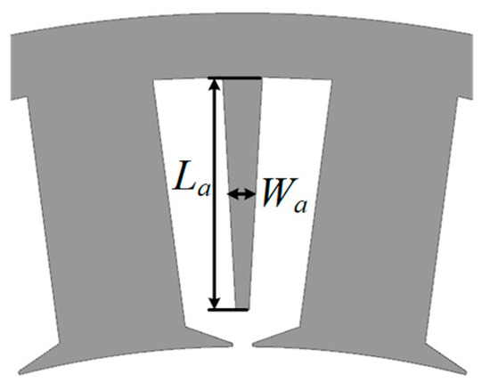 In order to reduce the degree of phase-to-phase coupling, a design of auxiliary teeth is conducted on the stator of the PMSM. The size of the stator auxiliary teeth has a significant impact on the self-inductance and mutual inductance of the windings, thereby reducing short-circuit current. Combined with the dual three-phase winding structure, the stator auxiliary teeth can improve the reliability and ensure the electromagnetic performance of the PMSM. Due to the adoption of a parallel tooth structure in the stator, the space in the stator slot is trapezoidal. Therefore, the trapezoidal auxiliary teeth are selected to reserve enough space for the windings and ensure the slot filling rate of the PMSM. The size of the auxiliary teeth is shown in Figure 7. It is evident that the length of the auxiliary teeth is La, and the width of the auxiliary teeth is Wa. The size of the stator auxiliary teeth can be optimized to suppress the short-circuit current and enhance the reliability of the PMSM.