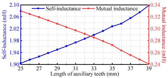 The variation of self-inductance and mutual inductance with respect to the length of the auxiliary teeth La is shown in Figure 8. It can be seen that La is optimized in a range from 25 to 39 mm for the design requirements under consideration. Additionally, it is apparent that the length of the auxiliary teeth La has a huge influence on the self-inductance and mutual inductance of the PMSM. The increasing La results in a decrease in the degree of phase-to-phase coupling. When the length of the auxiliary teeth exceeds 35 mm, the degree of phase-to-phase coupling can be reduced to less than 14%. Considering the depth of the stator slot, the length of the auxiliary teeth La is selected to be 35 mm.