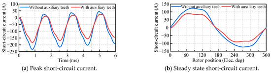 The short-circuit current reaches a steady-state value when the magnetic flux in the short-circuit winding is minimal. Conversely, the short-circuit current reaches a transient value when the magnetic flux in the short-circuit winding is maximum. The steady state and peak short-circuit current of the PMSM were compared both with and without the auxiliary teeth, as shown in Figure 11. The simulation results show that the steady state and peak short-circuit current of the PMSM with the auxiliary teeth are lower than those of the PMSM without the auxiliary teeth. Due to the adoption of the auxiliary teeth, the steady-state short-circuit current decreases from 123 A to 90 A, and the peak short-circuit current decreases from 234 A to 183 A, representing reductions of 27% and 22%, respectively. Additionally, the torque of the PMSM both with and without the auxiliary teeth are solved by finite-element analysis, as listed in Table 3. The adoption of the auxiliary teeth results in a decrease in average torque from 368 N·m to 354 N·m, accompanied by an increase in torque ripple from 2.6% to 2.9%. Therefore, the reliability of the PMSM is greatly improved while ensuring torque performance.