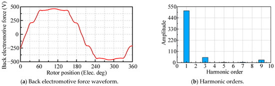 Based on the dual three-phase stator winding structure and auxiliary teeth, the final finite-element model of the PMSM is determined. Therefore, the electromagnetic performance of the proposed highly reliable PMSM can be calculated and analyzed. The no-load back electromotive force of the PMSM and corresponding harmonic orders are solved by finite-element analysis, as shown in Figure 12. It can be observed that the peak of the no-load back electromotive force is 463 V at a speed of 3500 rpm. The no-load back electromotive force coefficient is 0.132 V/rpm. The no-load back electromotive force waveform appears predominantly sinusoidal. However, due to an abundant third harmonic content, the no-load back electromotive force waveform exhibits a flat-top wave.