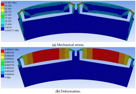 Additionally, mechanical stress and deformation analysis were performed to check the mechanical strength of the PMSM. The rotor core is the main stressed part. Therefore, the mechanical stress and deformation of the rotor core were analyzed, as shown in Figure 15. It can be seen that the maximum mechanical stress is 61 MPA, which is less than the tensile strength of the silicon steel material. The maximum deformation induced by the centrifugal force is only 0.008 mm. Therefore, the rotor core made of silicon steel has sufficient mechanical strength to withstand the centrifugal force and maintain operational stability.