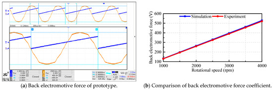 Comparison of experimental and simulated results. (a) Back electromotive force of prototype. (b) Comparison of back electromotive force coefficient.