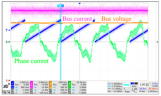 Since the PMSM used in the experimental platform lacks a water-cooled sleeve, only low-load experiments can be conducted. The low-load experimental waveforms are measured and shown in Figure 19. The blue line represents the electrical angle of the PMSM at 0.3663 V/rad. The red line shows the bus current, the yellow line indicates the bus voltage, and the green line corresponds to the phase A current. The electrical angle, bus current, bus voltage, and phase A current waveforms of the PMSM were measured. Under the steady-state conditions, the bus voltage was maintained at 600 V, the bus current was 15 A, and the peak-to-peak fluctuation of the bus voltage was 5 V. The phase current shows distortion, with a large third harmonic content.