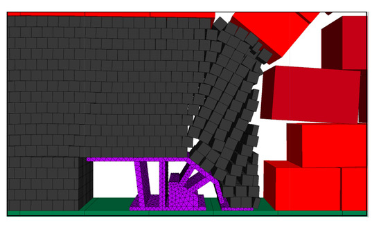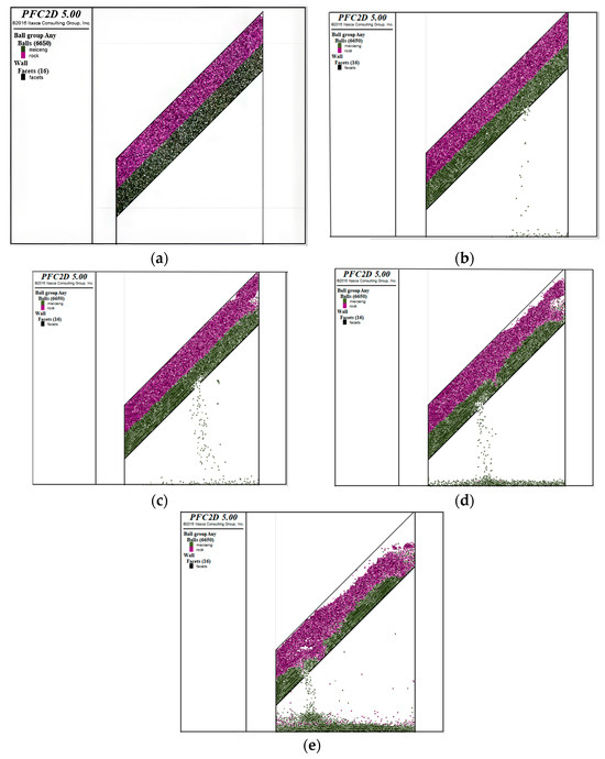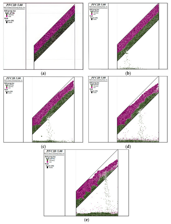 In order to ensure the accuracy and persuasiveness of the experiment, a wall model of the large inclination working face with an inclination angle of 45° was constructed in PFC2D (version 5.0) software and the contact intrinsic model was set up; the simulation results of the upward coal release are shown in Figure 1.