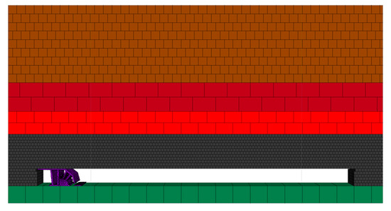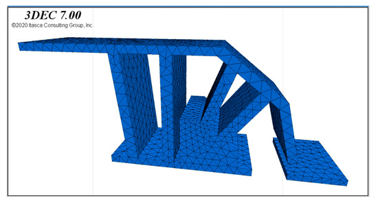 In 3DEC (version 7.0) software, using command flow, a numerical model of the working face is established based on the physical and mechanical parameters of the coal and rock layers obtained from research, and according to the position and distribution of the rock layers in the model. Based on the physical and mechanical properties of each coal rock mass in the actual working face obtained from the research, values can be assigned to the physical parameters of the coal rock mass according to the position and distribution of the rock mass in the model. Model boundary conditions and gravity acceleration can be set and equivalent stress applied above the model to simulate burial depth. After calculating the excavation range, the hydraulic support model can be imported to achieve coupling between the hydraulic support and the coal rock mass. The coupling model between hydraulic support and coal rock mass is shown in Figure 4. By modifying the code to change the model structure, the coal discharge efficiency of hydraulic supports can be analyzed and studied under different coal discharge step distances.