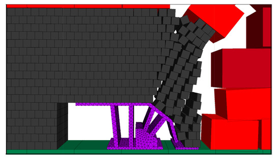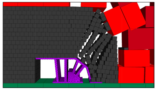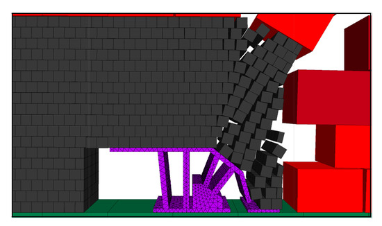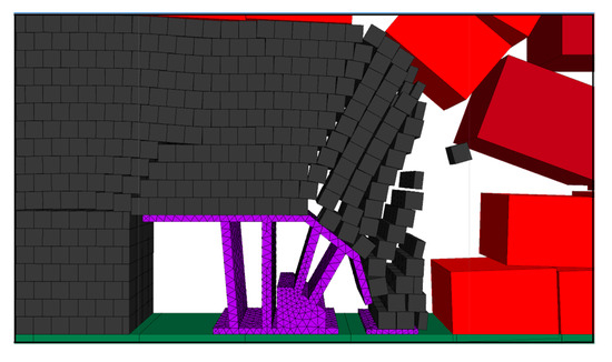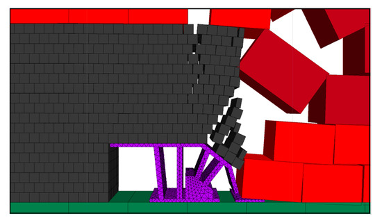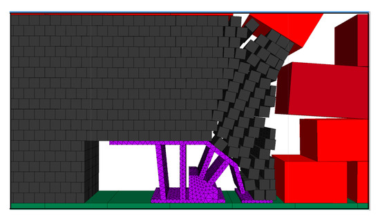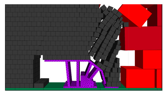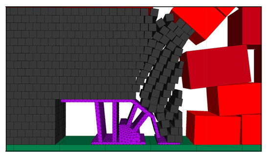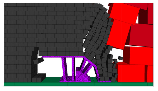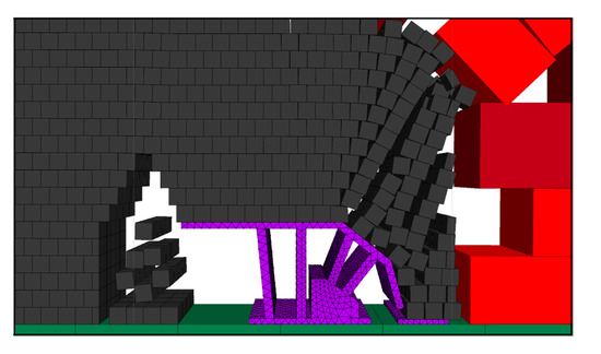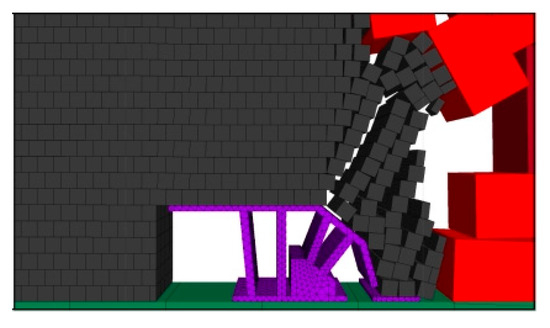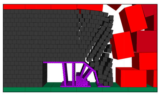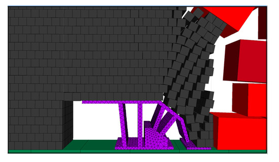 The top coal suspension distance was expanded, and the effect of coal release with hydraulic support when the step distance of the coal release is 1.2 m was simulated. The effect of two mining and one coal release of hydraulic support is shown in Figure 6.